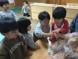 成長したきのこの大きさに驚く子どもたち。不思議そうに触っています。