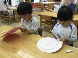 子どもたちが描いた絵の後ろに渦巻き状の線を書き、「この線の上を切ってみるとおもしろい凧になるよ」と保育教諭が話すと「やってみたい!」と言う子どもたち。