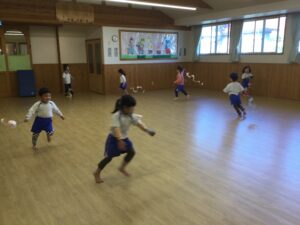 完成した凧をホールへ持っていくと元気いっぱい走り出し、「くるくるまわってる!」と楽しむ姿が見られました!