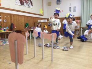 節分の日には、みんなで作った鬼のお面を被って遊びました。