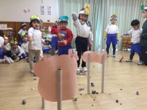 鬼の絵が書かれた的をねらって豆まきをしました。