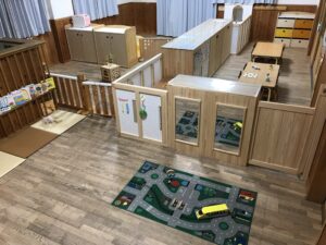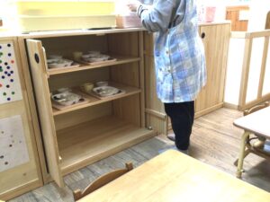 兵庫県より「ひょうご木の街木質化推進事業」の補助金を受けて、0・1歳児の保育室に収納・間仕切り棚を設置しました。