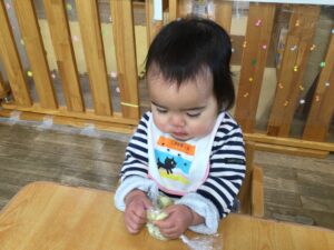 つぶしたお芋は先生に丸めてもらい、大きなお口で「あーん!」。