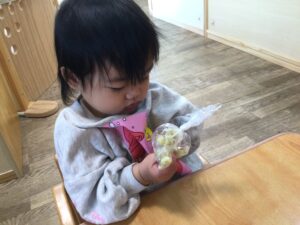 つぶれる感覚やぬるっと滑る感触が不思議でおもしろく感じたのか、とても良い力加減でつぶしてくれました。