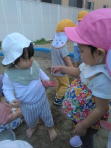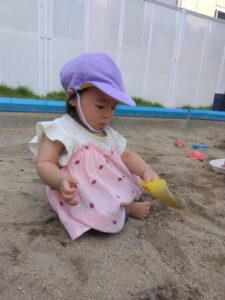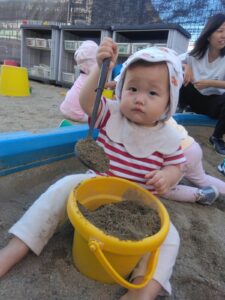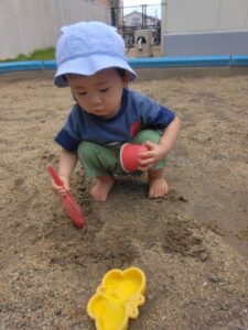 “すくう”という動作が少しずつできるようになり、スコップやお玉を使って砂をすくってカップに入れて遊んだりしています。
