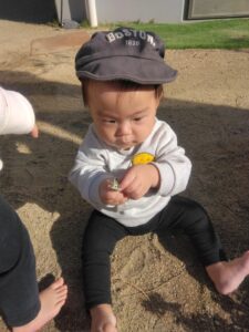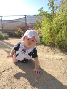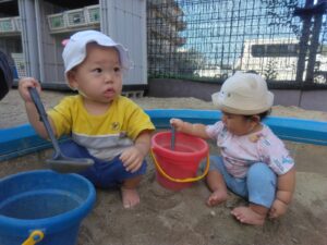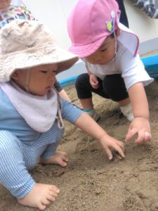 砂を触ったり、お花や草を見つけたりして園庭での探索を楽しんでいます!