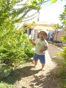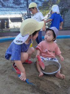 園庭遊びでは自然物を見たり触ったり、季節の風を感じたりすることで五感が刺激されたり、他クラスの子どもたちと交流することで自然といろいろな言葉を聞いて言葉に親しんだりしています。