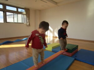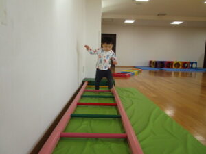 一本橋は、途中で足がついても何度も繰り返し挑戦しようとする姿が見られます。バランスを取りながら渡ることは難しいと感じながらも、カニ歩きをしたり、座って前進したり・・・。個々のできる範囲で楽しんでいます。