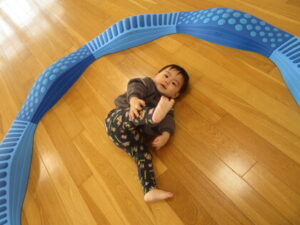 日々の探索を通して歩行が安定し、お友達と活発に動く姿が見られます。保育室では、トンネルをくぐったり、登ったり、お友達とハイハイや歩行で追いかけっこを楽しんだりしています。さらに体を動かすことを楽しめるようにホールに行って遊んでいます。サーキットを見ると、「どうやって遊ぶのかな?」と興味を示し、保育者やお友達が遊んでいる様子を見て一緒にやってみようとする姿が見られます。