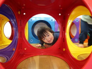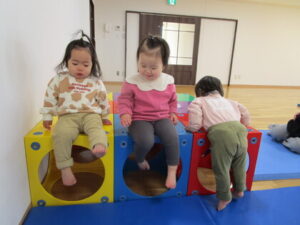 ゲームボックスは、穴の中をくぐってお友達と出会うと笑い合ったり、穴の中から「ばあ!」と顔を出したりしています。ゲームボックスの上に登って保育者に手を持ってもらいながらジャンプしたり、お友達と並んで座って足を前後に動かしたりして楽しんでいる様子です。