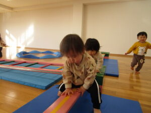 ホールでは、ハイハイや歩行が十分にできる広さであるため、子ども達も伸び伸び遊ぶことができています。サーキットでは、登ったり、跳んだり、くぐったり、またいだりすることで体全体を使って十分に運動遊びを楽しんでいます。寒い冬も戸外だけでなく、ホールでも運動遊びを楽しめるように子どもたちの発達状況や興味に合わせた環境づくりをしていきたいです。