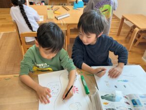 遊びに必要な物は何か話し合うと「海と魚と釣り竿と漁師さんの服作りなどが必要」と友達と協力しながらあっという間に完成していました。