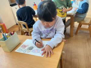 時計を見て魚釣りが出来るようにみんなで時計の針の位置がどこにきたら7分になるのか数えました。子どもたちは1つずつ数字を数えて、7分経つとどこに針がくるのか理解していました。
