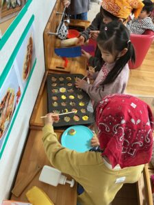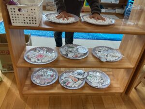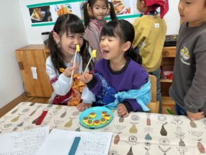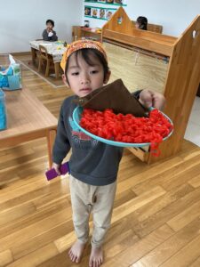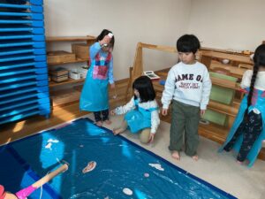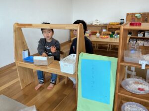 子どもたちからは「順番交代でする!」との声が出てきました。保育教諭が「何分経ったら交代する?」と聞いてみると「1時間?」「30分?」と長めの時間設定でしたが、ひとりの男の子が「時間が長すぎたら魚屋さんごっこの遊びが終わってしまうから、7分くらいの方がいいと思う!」との意見に全員が賛成!