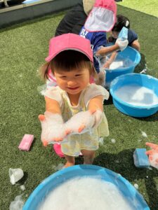 水あそびに慣れてきた頃、氷、寒天、泡などの感触あそびもしました。