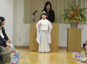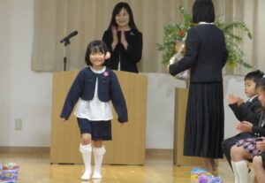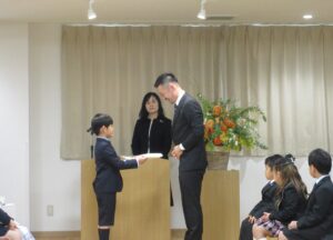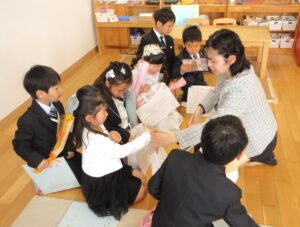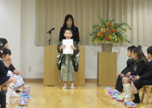修了証書を受け取ると、大きな声で将来の夢を発表し、保護者の方には感謝の気持ちを伝えながら、プレゼントを渡しました。